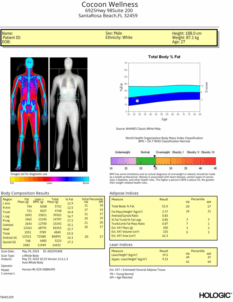 The scan distinguishes fat, lean muscle, and bone with medical-grade precision—delivering a detailed, color-coded map of your body that bathroom scales and smart watches can’t match.